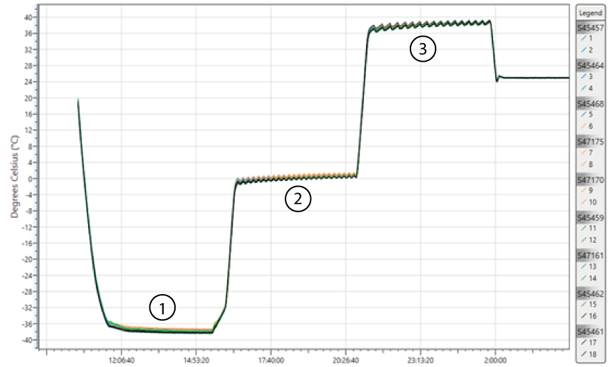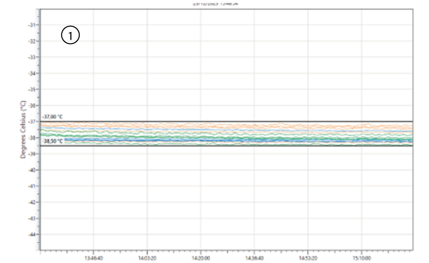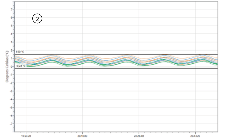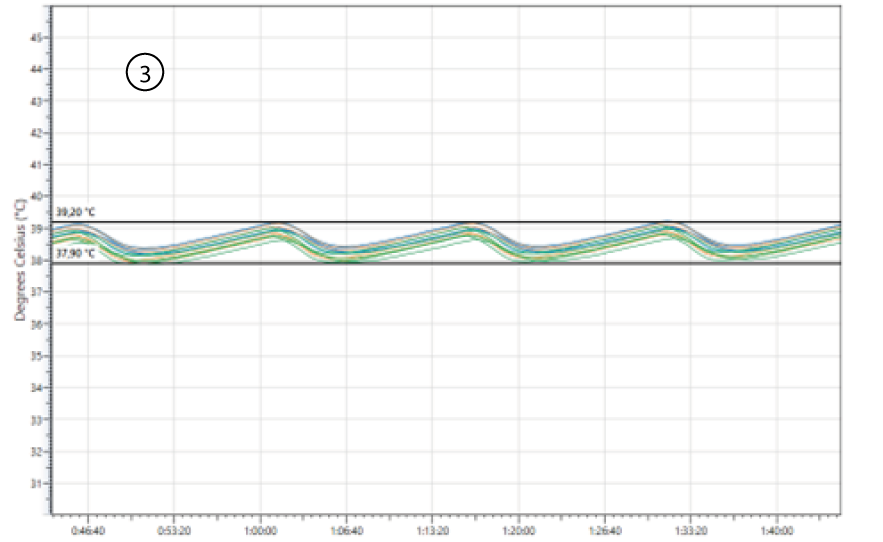 홀딩(holding) 단계에서는 설정값(set point)에서의 열매체(fluid) 조절로 인해 온도 변동(oscillation)이 발생할 수 있다(그림 7, 8 참조). 그러나 모니터링된 모든 지점에서 프로브(probe) 간 분포가 2°C 이하라면, 동결건조기는 선반(shelf) 균일성이 우수한 것으로 간주된다.
