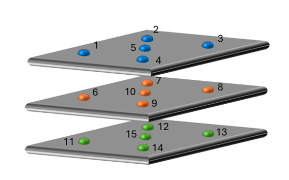 열전대(thermocouple)의 배치 위치는 선반의 모서리(corners)와 중앙(center)을 포함해야 하며, 이는 Recommended Best Practices in Freeze Dryer Equipment Performance Qualification: 2022 (1) 문서에서 권장된 사항이다(그림 2 참조).