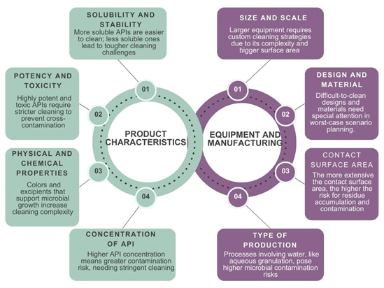 미생물 성장을 촉진하는 부형제: 미생물 성장 매체 역할을 하는 부형제는 제약 제조에서 큰 위험 요소가 된다. 이러한 물질이 세척 과정에서 완전히 제거되지 않으면 이후 배치의 안전성과 유효성에 영향을 줄 수 있다. 따라서 이러한 부형제를 포함한 제품은 최악 조건으로 간주되어, 세척과 밸리데이션 과정에서 미생물 잔류물이 충분히 제거되도록 더 엄격한 절차가 필요하다.